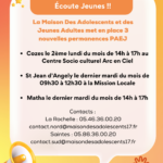 - 📢 On parle de la MDAJA17 !La Maison des Adolescent·es / Point Accueil Écoute Jeunes est à l’honneur dans Vidici Saintes… Lire la suite : 📢 On parle de la MDAJA17 !